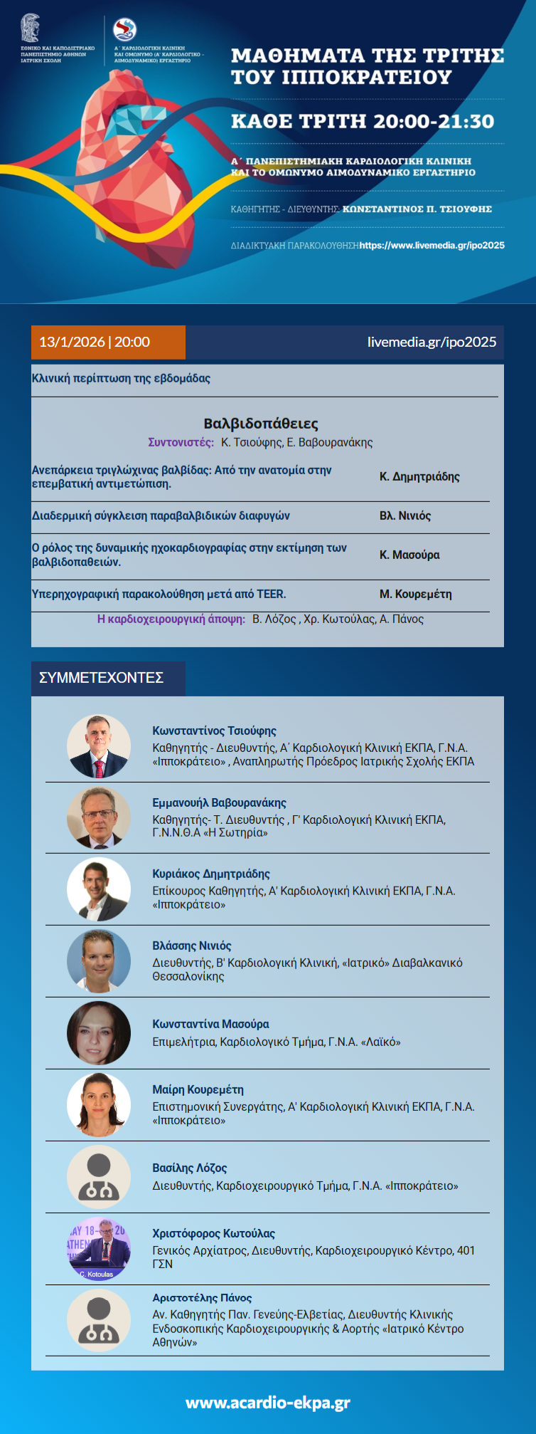 Τα «Μαθήματα της Τρίτης» που οργανώνει η Α΄ Καρδιολογική Κλινική του Πανεπιστημίου Αθηνών για 40 συνεχή χρόνια, έχουν διαχρονικά πρωτοστατούντα ρόλο στη συνεχιζόμενη εκπαίδευση των Ελλήνων Καρδιολόγων, διευκολύνοντάς τους να ενσωματώσουν την καθιερωμένη γνώση και τις νεότερες διαγνωστικές και θεραπευτικές εξελίξεις στην καθημερινή ιατρική πράξη.