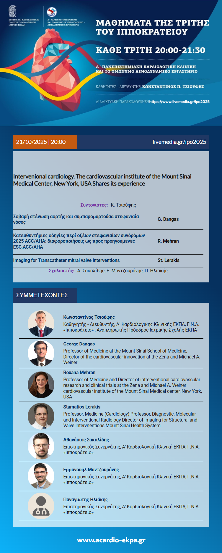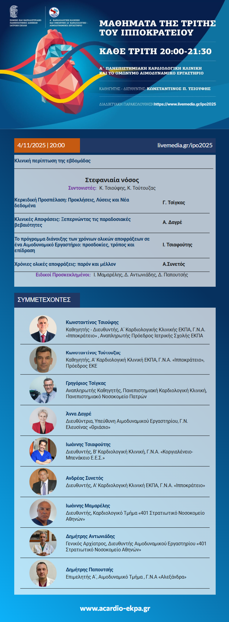 Τα «Μαθήματα της Τρίτης» που οργανώνει η Α΄ Καρδιολογική Κλινική του Πανεπιστημίου Αθηνών για 40 συνεχή χρόνια, έχουν διαχρονικά πρωτοστατούντα ρόλο στη συνεχιζόμενη εκπαίδευση των Ελλήνων Καρδιολόγων, διευκολύνοντάς τους να ενσωματώσουν την καθιερωμένη γνώση και τις νεότερες διαγνωστικές και θεραπευτικές εξελίξεις στην καθημερινή ιατρική πράξη.